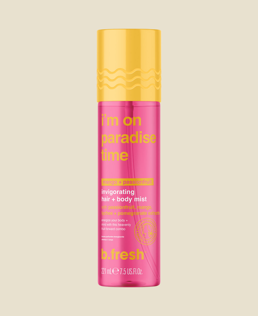 Llena de extractos frutales, esta bruma trabaja para vigorizar tus sentidos. Esta bruma para cabello y cuerpo está enriquecida con una mezcla floral y afrutada de mango, maracuyá y guayaba, para tu escape a un paraíso sin fin. ¡Porque no hay momento como el tiempo del paraíso!