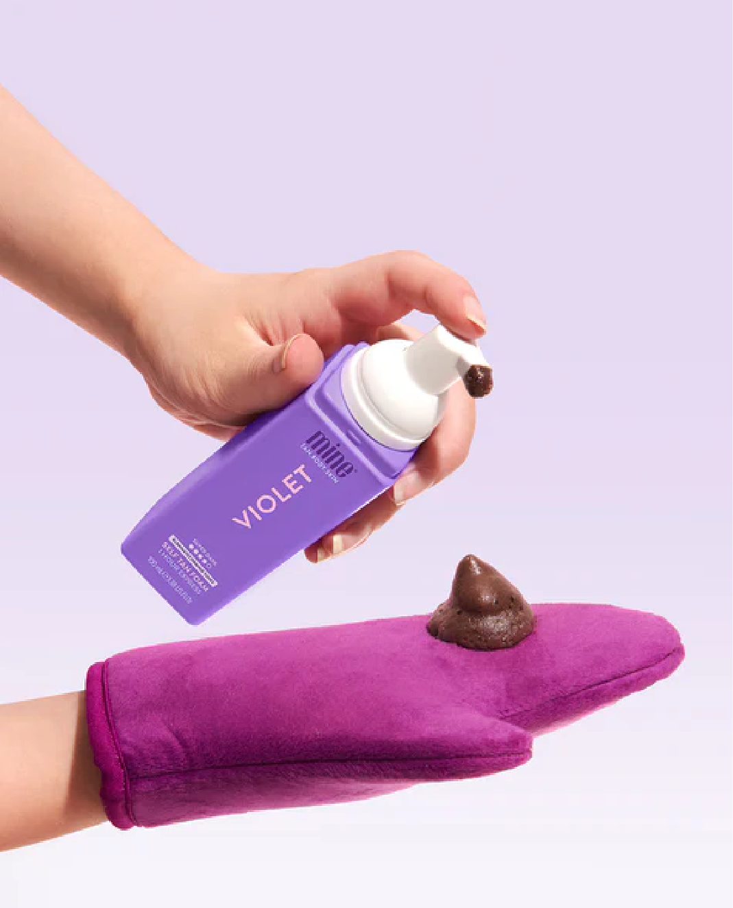 La Espuma Autobronceadora Violeta te ofrece un acabado marrón intenso y superoscuro gracias a una mezcla de bronceadores violeta y marrón oscuro que contrarrestan los matices amarillos y anaranjados. Experimenta las maravillas del bronceado con nuestro ácido hialurónico de origen natural y las vitaminas A, B3, C y E con el Sérum Facial Bronceador Wonder Tan. Ilumina y resplandece con los beneficios calmantes del agua de rosas con nuestra Bruma Facial Autobronceadora Iluminadora de Rosas de uso diario.